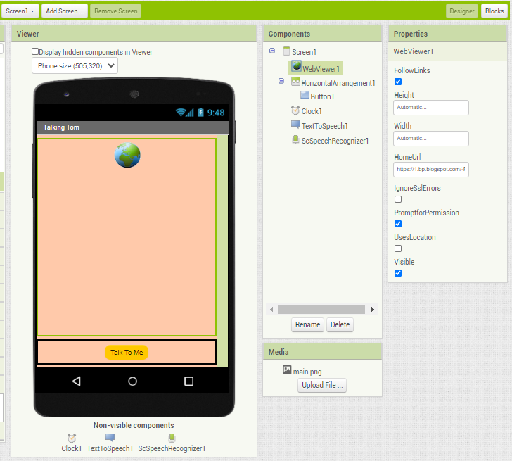 - 인터넷에서 talking tom animated gif 로 적당한 이미지를 검색하고 webviewer component 의 home url로 설정합니다.