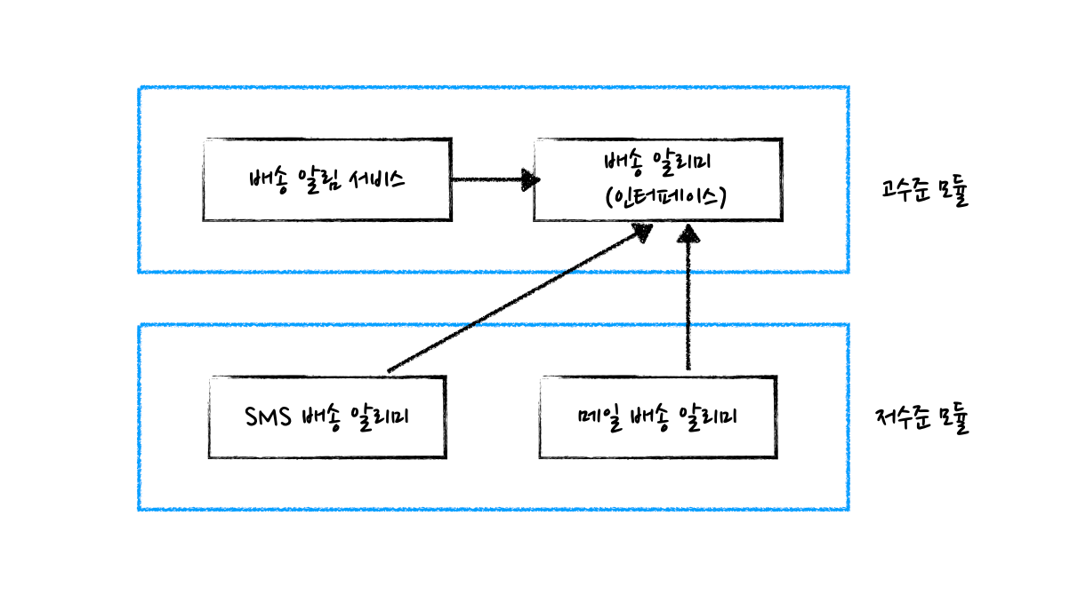 “배송 알림” 기능을 정의한 “배송 알리미” 인터페이스를 만들고, 저수준 모듈에서 “배송 알리미” 인터페이스를 구현한 저수준 모듈인 “메일 배송 알리미”나 “SMS 배송 알리미”를 만드는 것이죠.