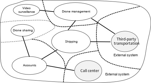 경계가 있는 컨텍스트가 반드시 서로 격리될 필요는 없습니다. 이 다이어그램에서 경계가 있는 컨텍스트를 연결하는 실선은 경계가 있는 두 컨텍스트가 상호 작용하는 지점을 나타냅니다. 예를 들어 배송은 고객 정보를 가져오기 위해 사용자 계정을, 선단에서 드론을 예약하기 위해 드론 관리를 사용합니다.