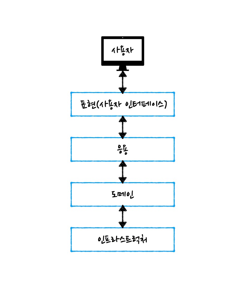 계층형 아키텍처에서는 일반적으로 상위 계층이 하위 계층에 의존합니다. 표현 계층은 응용 계층에 의존하고, 응용 계층은 도메인 계층에 의존하는 방식입니다.