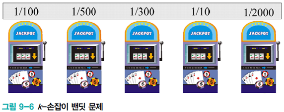 2번에서 잭팟이 나온 이후로 2번 기계를 더 자주 선택하는 대신 다른 기계에게도 계속 기회를 주며 잭팟이 또 터지면 새로운 정보를 고려하여 확률을 배분하고 수정하는 것입니다.