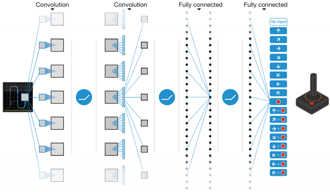 CNN과 Q-Learning을 결합한 DQN으로 상태를 입력하고, 게임 종류마다 필요한 만큼 출력 노드를 정합니다.