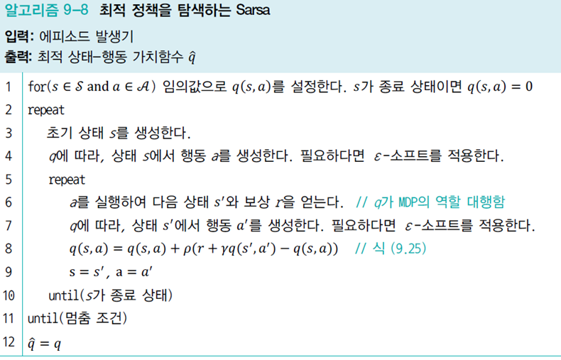 line 7에서 볼 수 있듯이 Sarsa는 다음 행동을 정책에 따라 결정합니다.
