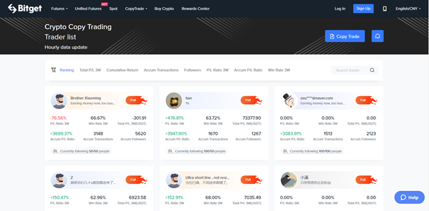 MoonXBT, 비트겟, 빙엑스의 세 거래소 모두에서 팔로워는 자산, 순위, 승률 또는 수익률, 팔로워 등을 기준으로 트레이더를 정렬할 수 있습니다.