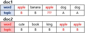 즉 A 안의 cute는 (0.00008, 0.114)의 카테고리 분포를 따라 주제1이 되거나 주제2가 되겠죠. 가능도 비중을 따라 주제1이나 주제2 중에 하나를 뽑습니다. (물론 높은 확률로 주제2가 뽑히겠죠. 하지만 주제1이 뽑힐 가능성이 아예 0이 되지는 않습니다. 이는 하이퍼 파라미터 α와 β가 하는 역할 중 하나에요.) 여기서는 주제2로 배정되었다고 가정할게요.